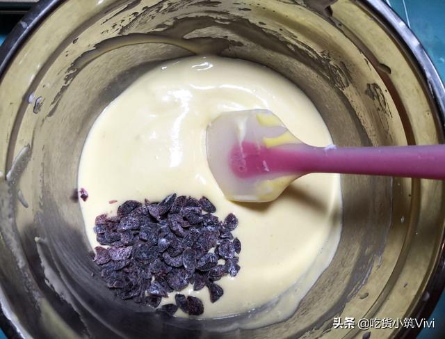 6、将蔓越莓干倒入面糊中。翻拌均匀。