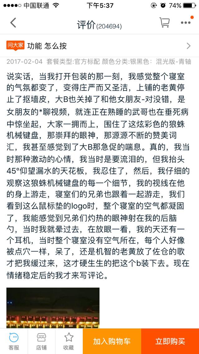其次。既然剁手族的数量那么大。对淘宝购物的评价也就特别多。看网友们的评论也很有趣。因为每个评论都是一个小段子。非常搞笑。比如。有个人相中了一款网眼防晒衣。她想象中自己穿上它应该是仙气飘飘美如画。结果等实物寄到打开一看。乖乖。不就是个薄如蝉翼的蚊帐吗?自己一脸嫌弃地在评价上说:\"老板。你这防晒衣是专门对蚊子定做的吗?\"