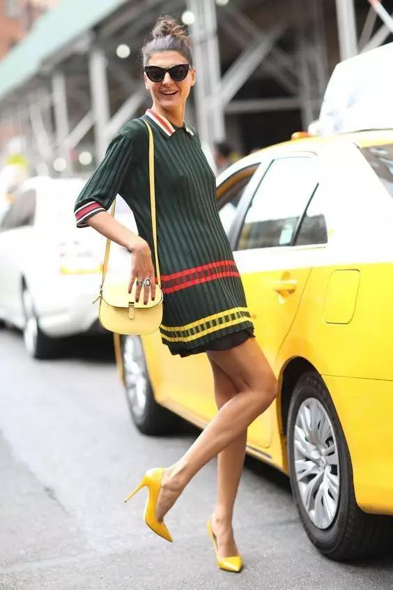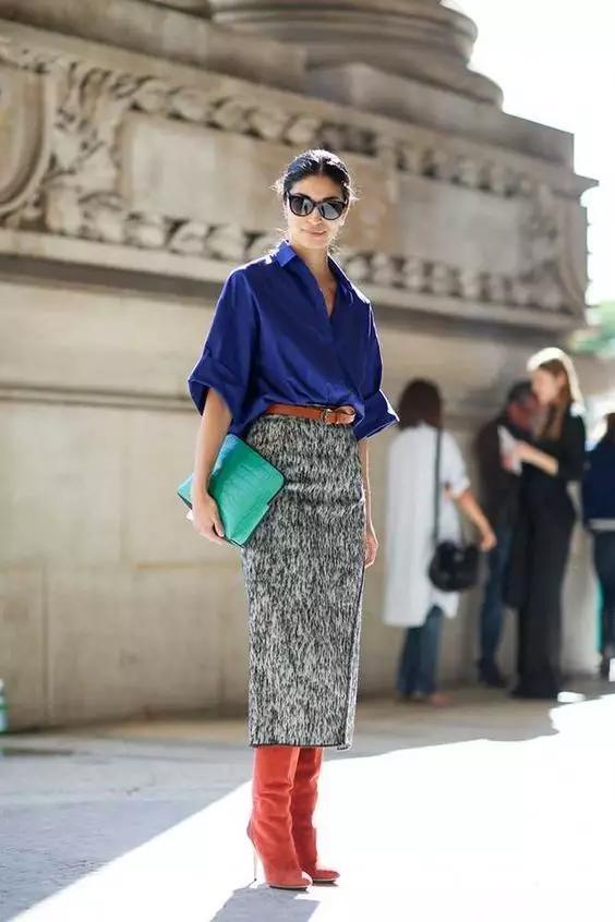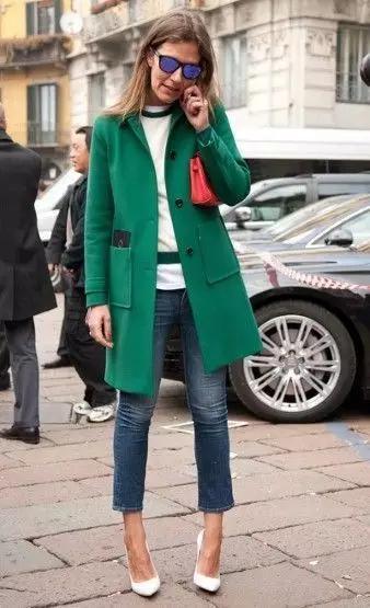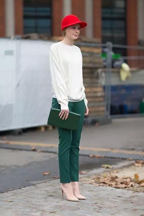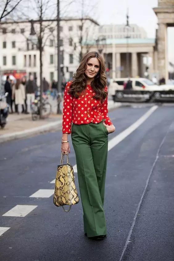 时尚精们总能有办法解决一切穿搭难题。红配绿的时候。一种颜色大面积使用。另一种则小面积点缀。不是两大色块相配就好很多。还有点撞色的趣味: