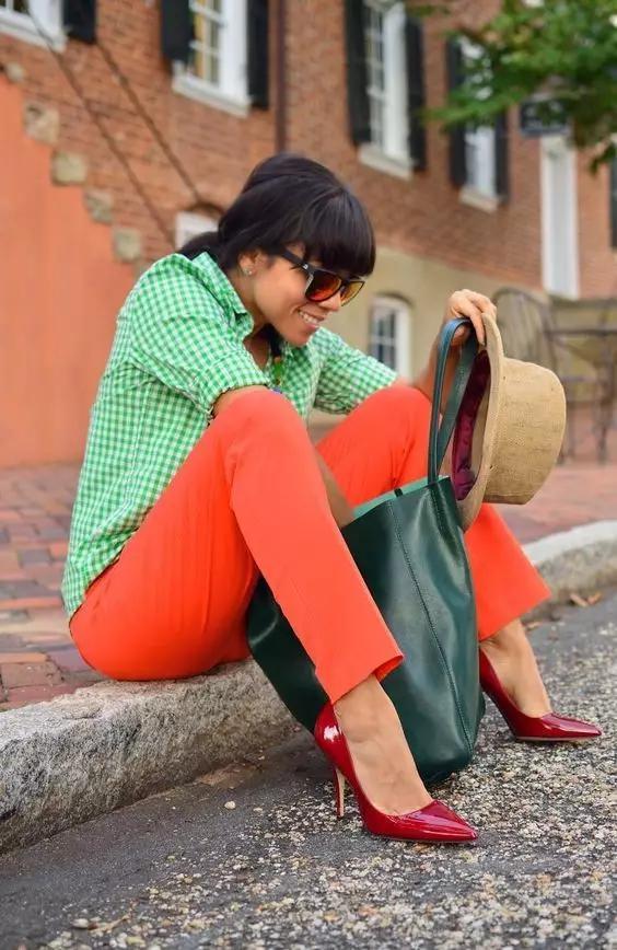 如果经常看街拍你会发现。红配绿在欧美女生的穿搭中还挺常见的。但亚洲女生本来肤色偏深。穿上高饱和度的红+绿组合。就很容易穿出土气感。
