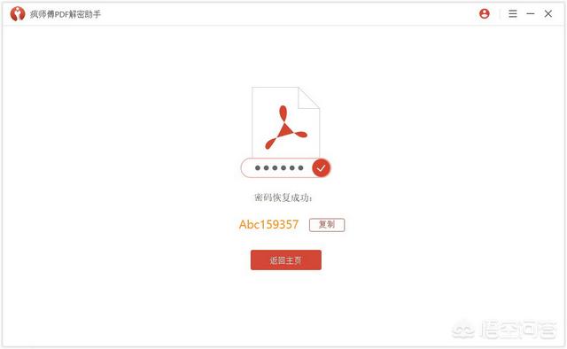 当密码被找回后。它将显示在软件界面上。您可点击“复制”。用于解锁您的PDF文件。
