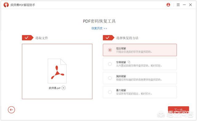 打开疯师傅PDF解密助手。选择“恢复密码”。
