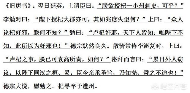 听到德宗问话。马上整冠下拜。说道:“我之前听说外人说。皇上相当于汉朝的桓、灵二帝。现在看来就是尧、舜也比不上您呀!”(“累日外人窃议。以陛下同汉之桓、灵;臣今亲承圣旨。乃知尧、舜之不迨也!”)