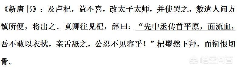 颜真卿去见卢杞。对他说:“你先父卢中丞(指卢奕)的头颅送到平原郡。脸上满是血。我不忍心用衣服擦。亲自用舌头舔净。你还容不下我吗?”
