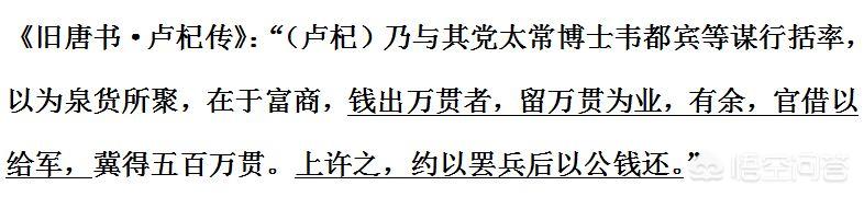卢杞为了筹措每月一百万贯的军费。让自己的党羽赵赞、韦都宾上奏德宗说:“国家没钱平叛。可富商有钱呐!家财超过万贯的。留一万贯持家。多出来的借给国家。按这个办法筹集五百万贯军费。分分钟就能搞定。”