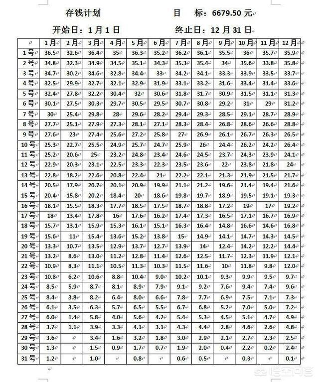 其实就是一种自己给自己约定。给自己压力的储蓄方法。只是储蓄的过程本身是一种游戏性比较强的过程罢了。没有太大的约束力。简单来说365存钱法就是配合手账使用。按每年365天。每天从1到365中任选一个数字存钱。每一天的数字都不能重复。这样一年下来就有66795元。如果觉得365元还是挺多的。可以退而求其次。退一位从0.1-36.5之中排列。那么一年下来也有6679.5元。