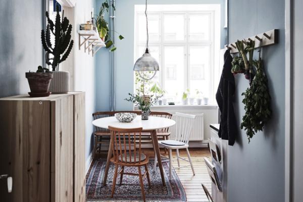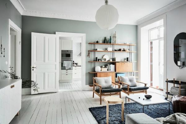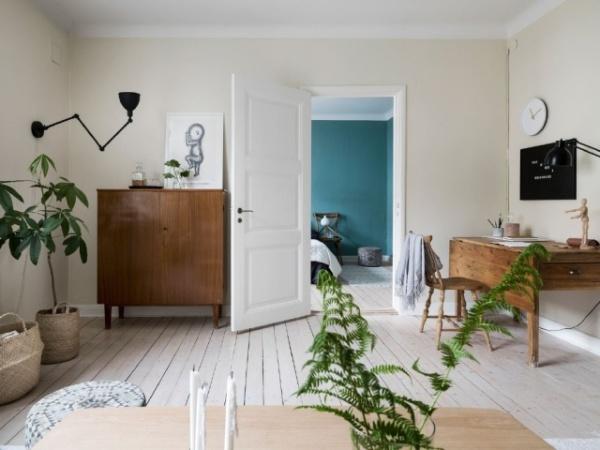 反正北欧家庭里面最常见了啊。和胡桃木家具简直是天生CP配一脸。只刷一面墙就能衬得家具很好看。全屋都刷蓝的话也不会压抑 ▼