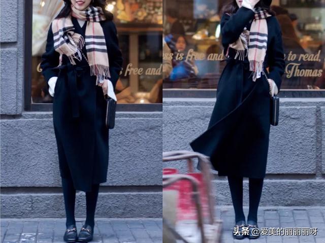 黑色系带大衣保暖显身材。内搭白色打底提亮了肤色。