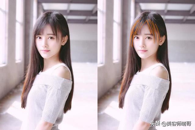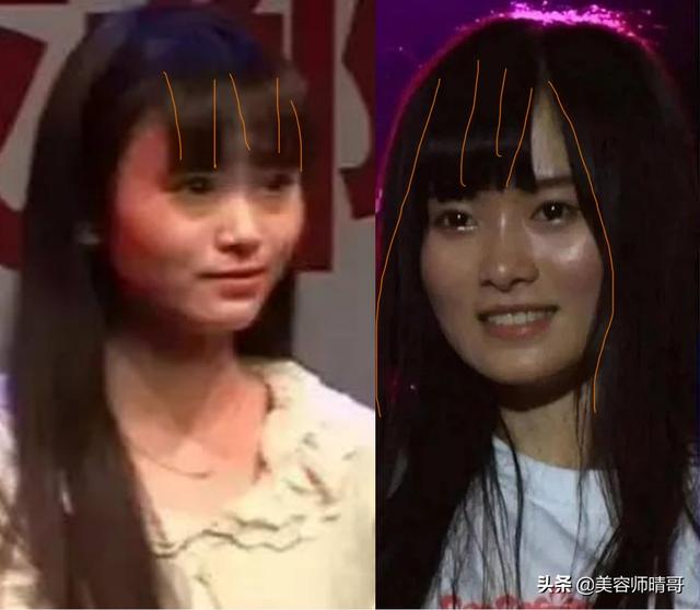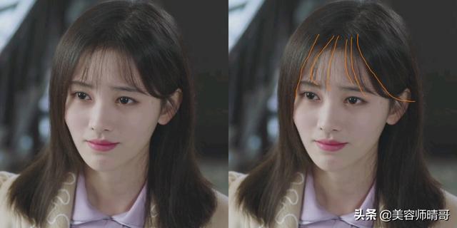 八字空气刘海:中间的倒三角形让她的额头变窄了。颧骨虽然盖住。但是有一种欲盖弥彰的感觉。她的下巴其实很瘦。会有点显得憔悴。有留空刘海时。视线就会下移。变得更突出。
