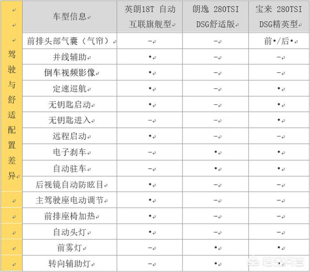 从上表中可以看出。三车在配置上还是有着一定的不同。在安全配置上。英朗相比朗逸和宝来多出了并线辅助、倒车视频影像的功能。对于行驶时的安全性有着一定的保证。朗逸在三款车中的安全配置比较差强人意。仅装配了自动驻车一项功能。而宝来相比朗逸配置更丰富。其中主动刹车系统在三车中属于独有配置。也算是一个不小的亮点。