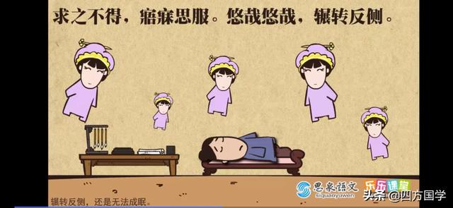第二、三章写男子思念女子之苦。第二章里的“左右流之”的“流”既流动的意思。其意是说。荇菜在水中漂流不定。暗喻“窈窕淑女”尚未婚配。引起君子求婚的之意。