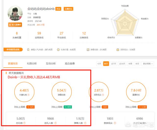 这是大史官从专业的直播数据统计网站找出来的信息。Doinb在28号晚上的直播中一共收到了4.48万RMB的礼物。他一共直播了五个小时。平均是一个小时收入近万元。这也是Doinb如此敬业直播的原因。有这么高的收入是换了任何一个普通人都忍受不了诱惑的;