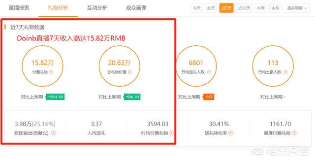 再来看一下Doinb近7天的礼物收入。一共受到了20.63万的礼物。其中付费礼物达到了15.82万的礼物。也就是说这些礼物最少都是办卡、飞机、火箭之类的虚拟礼物。除去了平台的分成。Doinb最少可以拿到一半的钱。这就说明了主播到底有多赚钱了。而且Doinb作为一名职业选手相信签约直播也有高额的签约金。这个收入是观众所不了解的。起码都是数百万以上的。