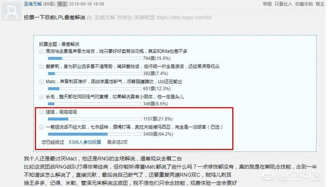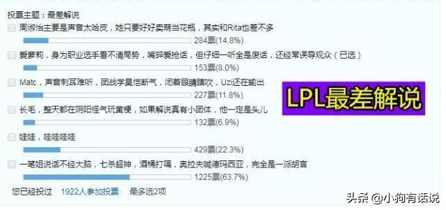 英雄联盟LPL联赛在今年已经成为电竞领域的标杆。因为收看人数最多。而且官方投入的力度也是最大。受到了各界的肯定。但是有一方面却始终受到网友的吐槽。那就是LPL的解说。在S9总决赛来临之前。网友们进行了一次投票。票选出LPL最差的解说。让出乎意料的去年拿到LPL官方最佳解说的娃娃得到了21.8%的票数位列第二。第一名正是今年离开王多多独挑大梁的“一笔姐”