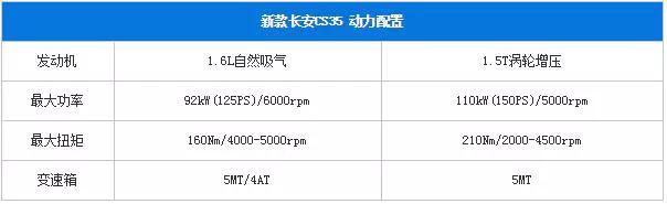 新款长安CS35将提供1.6L和1.5T两款发动机。传动部分。1.6L匹配5MT或4AT;1.5T仅提供5MT。