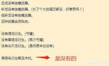 而我个人最期待的。像青龙偃月刀一般的黑狼鸟居然也没有衍生。着实有点失望。还有角王剑也是没有的。所以网友说大剑“最惨武器”是有道理的。暂且不知道未来会不会像本篇一样追加一部分衍生。又或者是即将配信的金狮子搞个金刚棒或者以后来个M级喷气之类抚慰下大剑玩家受伤的心。你们说呢?