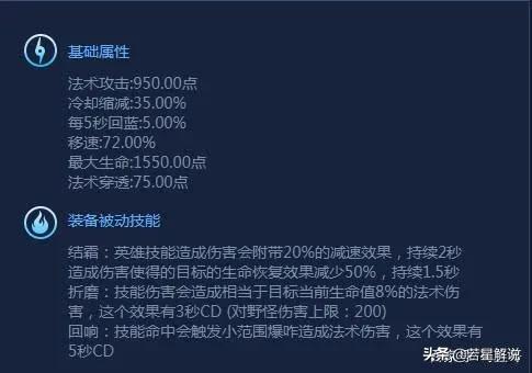 总属性:法术攻击:950.00点;冷却缩减:35.00%;每5秒回蓝:5.00%;移速:72.00%;最大生命:1550.00点;法术穿透:75.00点。
