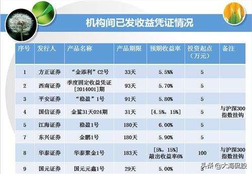 五。券商的收益凭证。收益凭证是目前唯一一款承诺保本保息的理财产品。周期从十几天到一年不等。收益凭证的利息一般在5%以上。