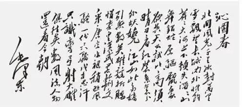 “冰封”。“雪飘”静动相衬。相得益彰。“望长城内外。惟余莽莽。大河上下。顿失滔滔”。总领下文。直至“欲与天公试比高”。“望”有登高远眺的意思。并有很大的想象成分。它显示了诗人形象的伟岸。“望”字下面展现出了长城、黄河、山脉、高原这些最能反映北国风光的雄伟景观。也正是中国形象的体现。“长城内外。大河上下”。诗人的视角从南到北。自西向南。地域如此广袤。并照应“千里”。“万里”。意境大气磅礴。显示了诗人博大的胸襟。雄伟的气魄。“惟余莽莽”。顿失滔滔”又分别照应“雪飘”和“冰封”。作者极言北国冰雪覆盖。寒冷之极。一个“惟余”。强化白雪皑皑的壮阔景象。一个“顿失”。写出变化之速。同时。又让人联想到未冰封的大河波涛滚滚的雄壮气势。在诗人笔下。一个周天寒彻。漫天大雪。天地之间被风雪改变了容颜。只见长城内外苍茫一片。了无生机。连滔滔江河也被雪冻冰封。奔流不再。神州北国仿佛进入了一种死寂。不禁让人联想到柳宗元写雪的名句“千山鸟飞绝 。万径人踪灭”。好一番人间苦难。以上描写的是静态的景。