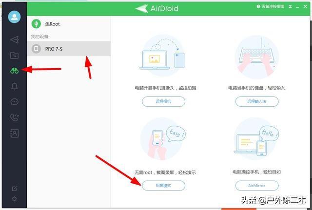 因为是需要投屏。所以必须安装电脑版的和手机版的投屏软件。你可以先下载电脑版的。然后打开软件就可以得到手机版的下载链接。以AirDroid为例。打开AirDroid后。再选择【观察模式】。这里不需要录制。只要将观察模式放大界面就可以了。