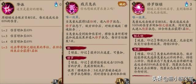 鬼童丸定位还是以输出为主。配置要求极高。伤害高。适合斗技。
