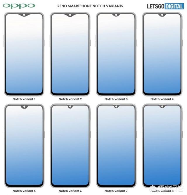 其中一幅图片展示了一个几乎被屏幕填满的手机正面(带有水滴形刘海开孔)。并且一共有八种不同的开孔样式(彼此之间的差异很小)。