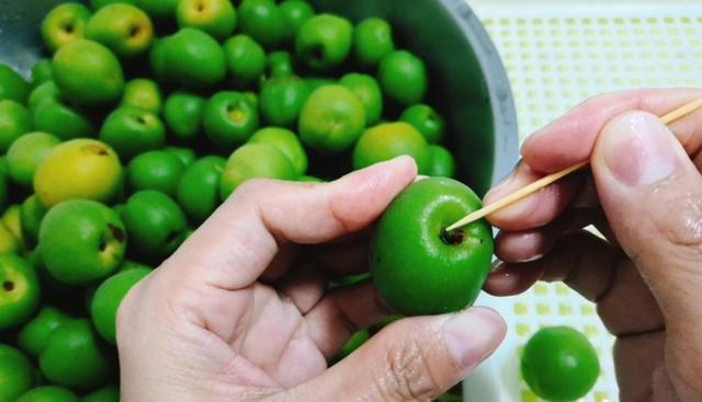 接着用牙签把青梅果蒂去掉。不去掉青梅酒会苦。