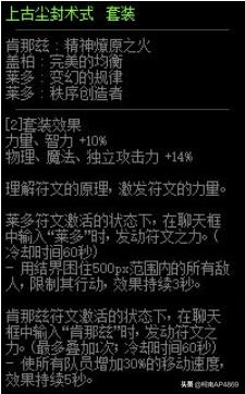 首先这位玩家穿的史诗装备为上古尘封术士套。当玩家在副本中。输入莱多。可以发动符文之力。用结界困住500px范围内所有敌人。限制其行动。效果持续三秒。当玩家输入肯那兹时。依然会发动符文之力。使所有队员增加30%的移动速度。根据属性来判断。这套是史诗装备也就归纳于打字套了。玩家穿上之后。就得不停地在副本中。打两个词语。一个就是莱多。另一个就是肯那兹。虽然说麻烦是麻烦了点儿。但是只要能够增加角色的属性。打字也就值了。