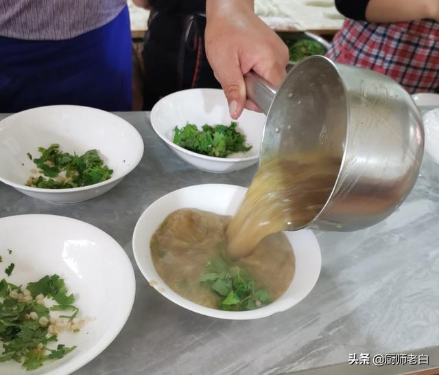 “sà”汤。这家店是用牛骨头熬的汤。味已经调好。碗中放好葱花香菜和小麦仁。鸡蛋一个打碎放入碗中。浇上汤就可以了。