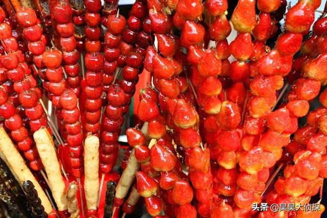 小时候在小镇上常常有人拿着一根棍子上面插满了密密麻麻的冰糖葫芦。每次看着都超级想吃。酸酸甜甜好开心。
