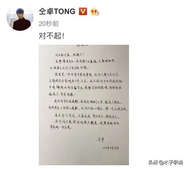 引起网络热议后。仝卓手写书面道歉信。我不知道他有没有真正的认识到自己的根本问题。
