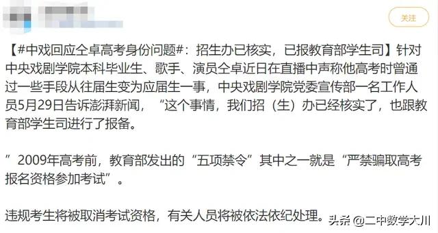 早在2009年。国家教育部门就发布“五项禁令”。其中有一条就明确规定“严禁骗取高考报名资格参加考试”。仝卓如果该事件属实的话。应该就是符合这一条。自己的演艺生涯也将会“断送”。