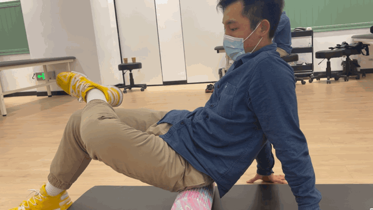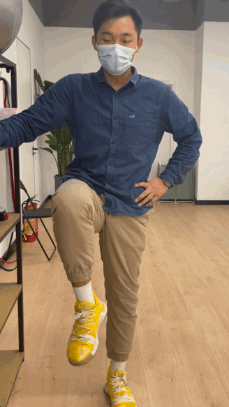 单膝支撑。保持上肢稳定。同侧手抓住同侧脚。同时将小腿往大腿方向拉伸。慢慢向前倾斜身体。通过拉伸大腿内侧肌肉。顺势牵拉骨盆。让其回到正确位置。左右腿交替8~10次。