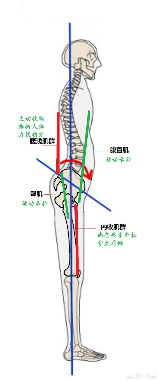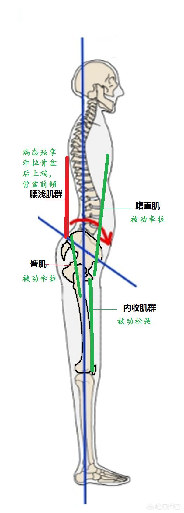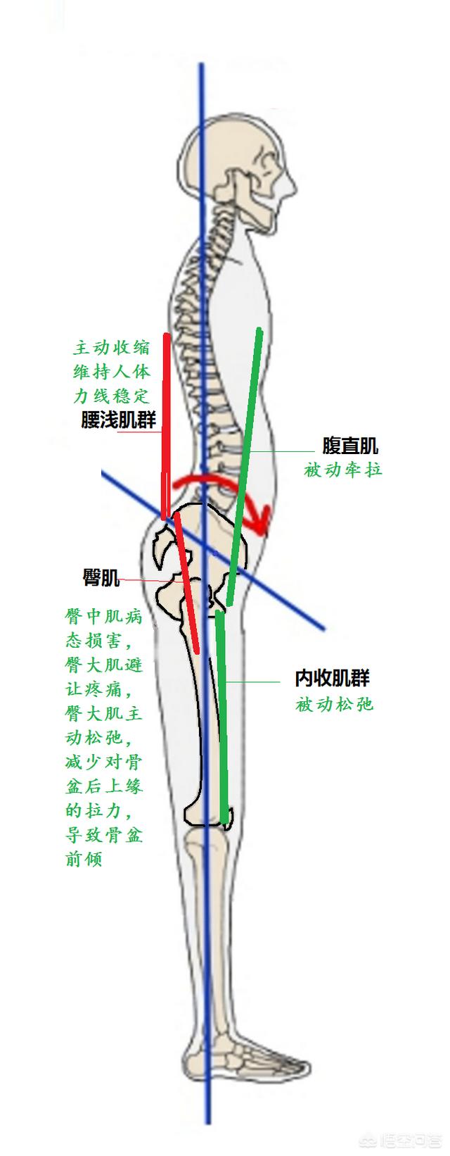 骨盆前倾就松弛了大腿根内收肌群。因此。如果先有腰部浅层病态问题。不会导致内收肌群出现问题。臀部肌群和腹直肌被动牵拉。暂时没事。