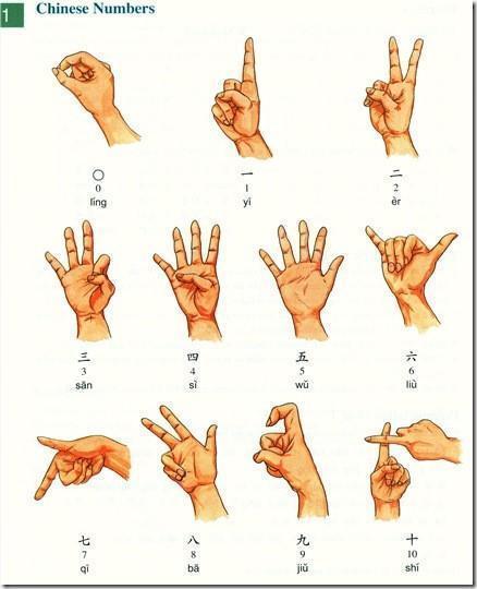 (0。用拳头表示。图上0的手式是七的表示。大拇指伸出拳是10的表示)