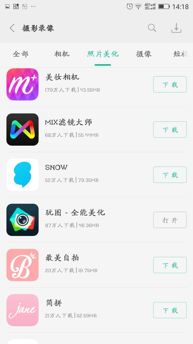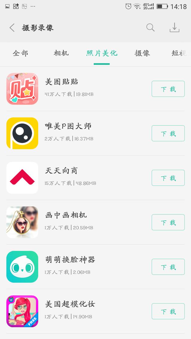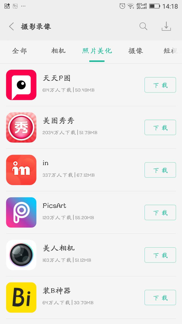方法不难:去手机自带的应用商店。或者第三方的应用市场如应用宝、豌豆荚。百度手机助手。在分类里找到【照片美化】这个子分类。就会出来很多修图工具。在这些修图工具里。大多都是带有美颜功能的。