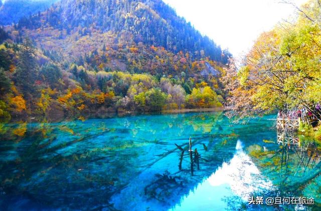 1、九寨沟。到处都是泉、瀑、河、滩。构成一个个五彩斑斓的瑶池玉盆。长海、剑岩、诺日朗、树正、扎如、黑海六大景观。共同演绎、描绘翠海、叠瀑、彩林、雪峰、蓝冰等神奇的景色。九寨沟纯粹得如天堂般的秋色。自然得摄人心魂的秋韵。深深地吸引。“九寨归来不看水”。是所有九寨沟回来的游客最真实的体验。同时。又是对九寨沟叹为“此景只有天上有”的最佳诠释。