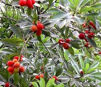 杨梅果实深红。味酸甜。肉多汁。富含多种维生素、纤维素、矿质元素。钙磷铁高于其他水果10倍。可直接食用。可做果脯。可酿酒。