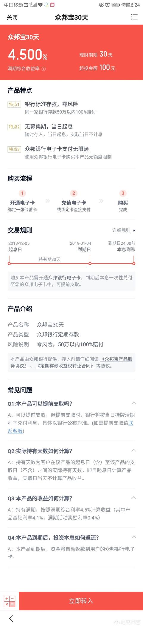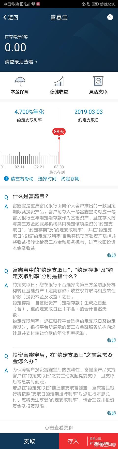 富鑫宝最低存放8天。收益率4.250%。8天后可以随时存取。存放越久。收益率越高。存满88天。收益率4.7%。提现即时到账。存款性质。本金有保障。收益率固定。本人最推荐这款!