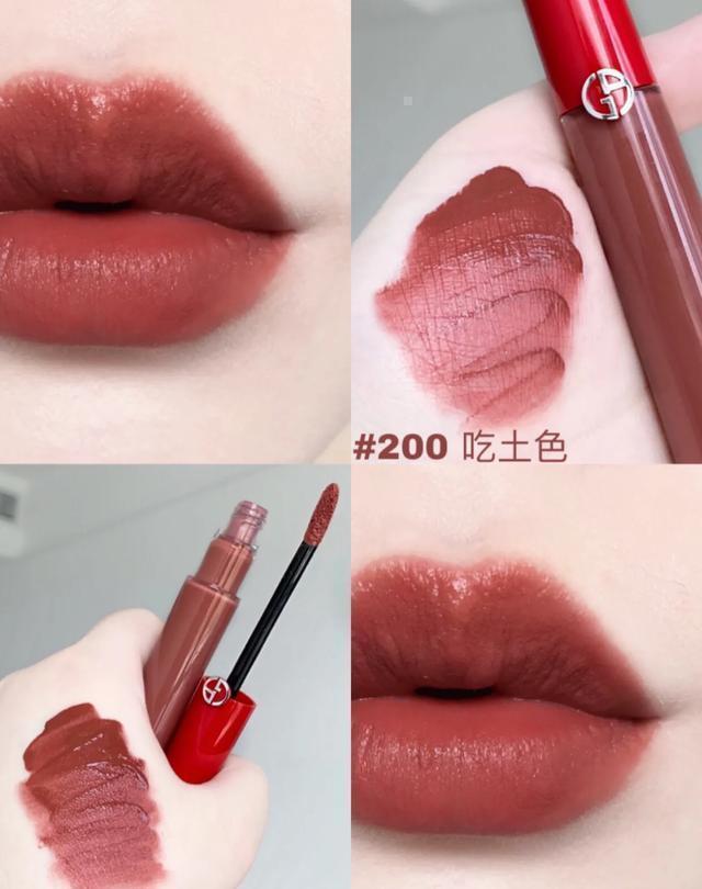 阿玛尼#200经典红棕色。秋冬必会隆重登场色。丝绒半哑光质地。不会很干。有点淡咖啡色➕巧克力色甜甜感。白皮最佳。黑黄皮绕道。