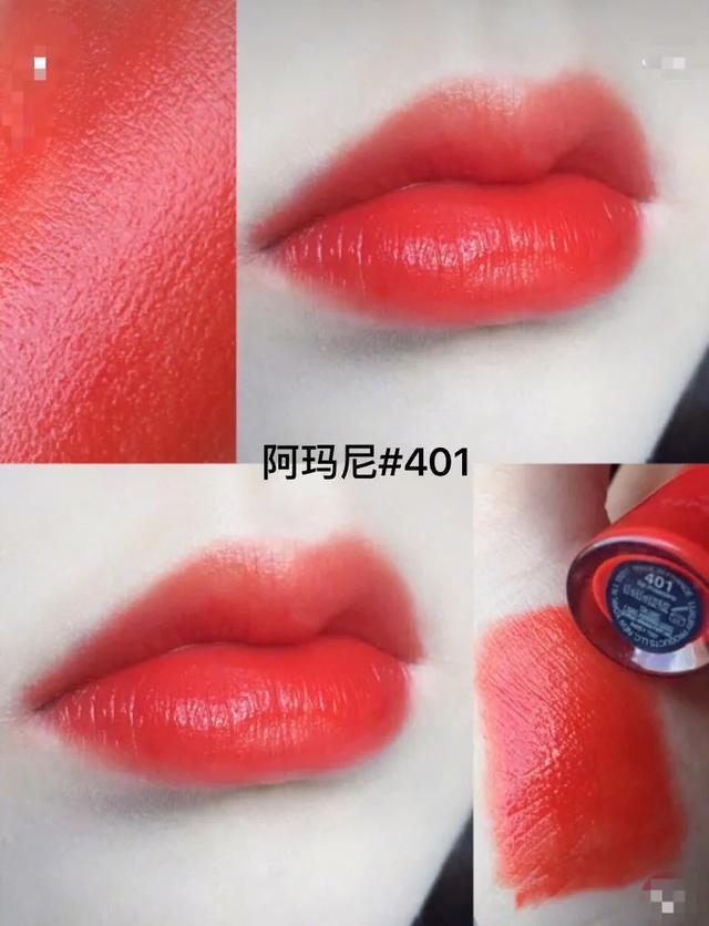 阿玛尼#401樱桃橘红色不荧光。很显白不挑肤。很很鲜嫩很丰富的色泽。纯色白、黄皮必入款。