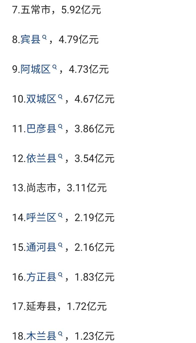 但是从哈尔滨市的道外区开始往下数。财政收入第七名的五常市财政收入和前六名的财政实力差距非常大。只有不到六个亿。