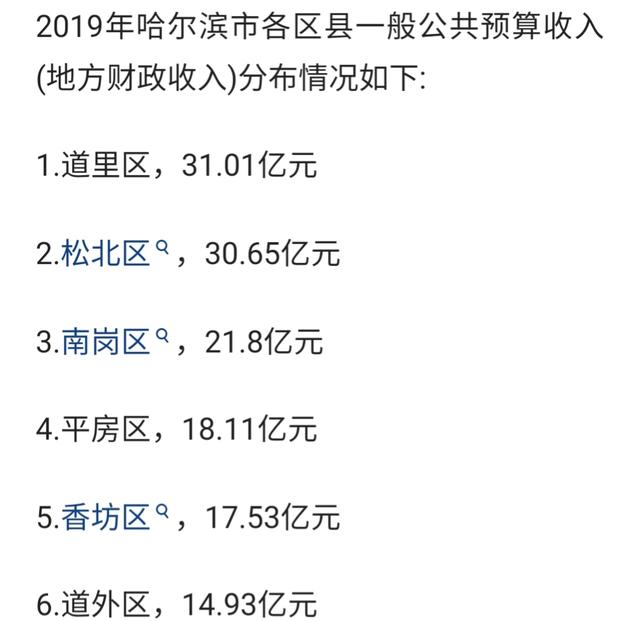 如下图所示。在哈尔滨市各区县一般公共预算收入排名中。哈尔滨市的道里区。松北区的财政收入稳居全市前列。达到了30多个亿。财政实力非常不错。