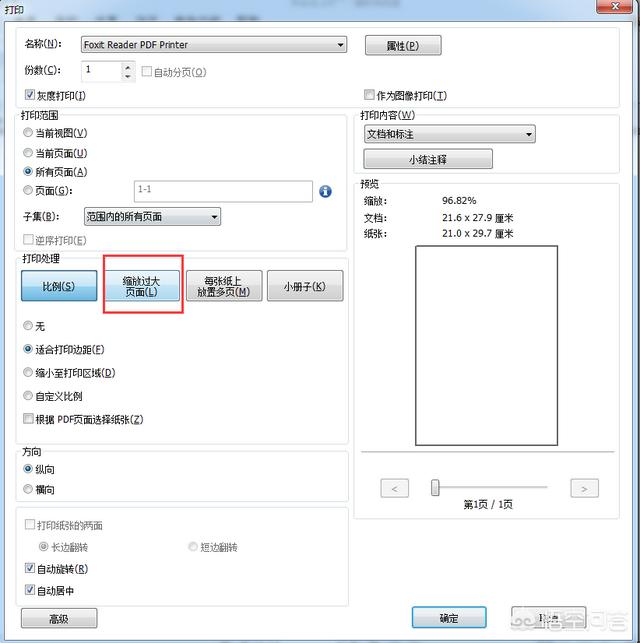 可以使用福昕阅读器--打印--打印处理--选择 缩放过大页面。