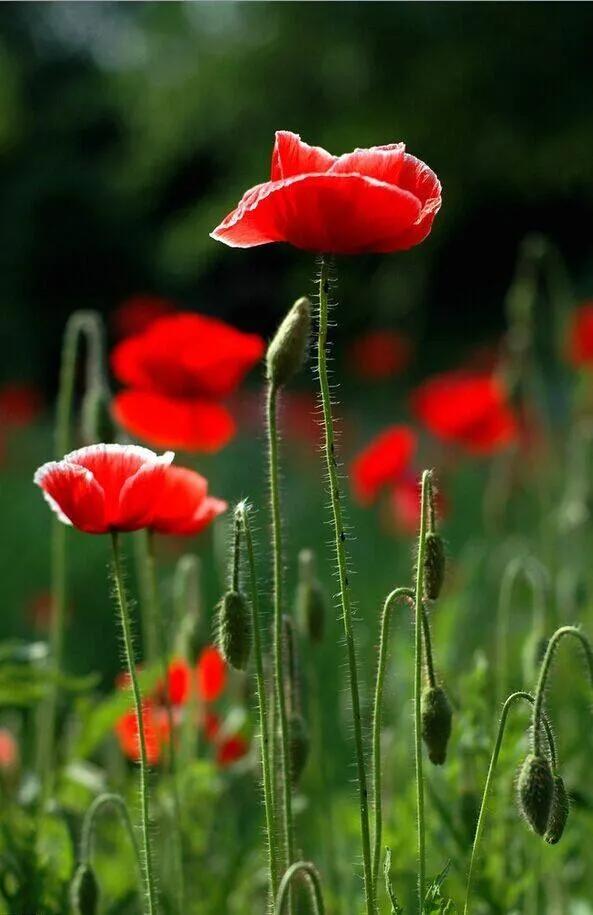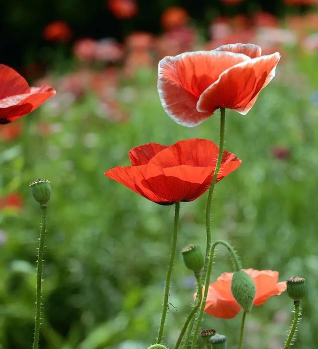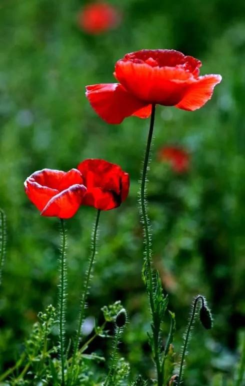 2。虞美人;一年生草本植物。花期4一5月份。花朵大红色或血红色。花朵黑心白边。非常漂亮。有很高的观赏价值。