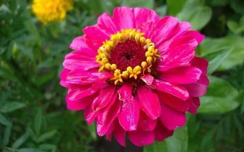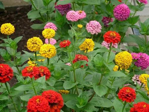 3。百日草;(百日红。步步登高)。一年生草本植物。花期6一9月。花色红、黄、白、粉、等多种颜色。花朵漂亮。有很高的欣赏价值。