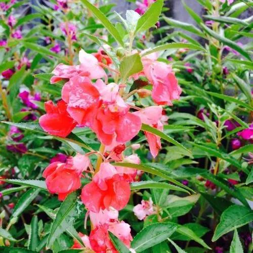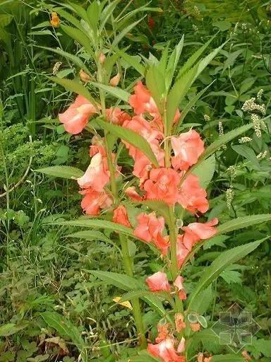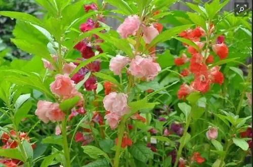 5。风仙花;(指甲花)一年生草本植物。花期7一10月。花朵有粉红、大红、粉紫等颜色。女孩用树叶包在指甲上。能染成红色。