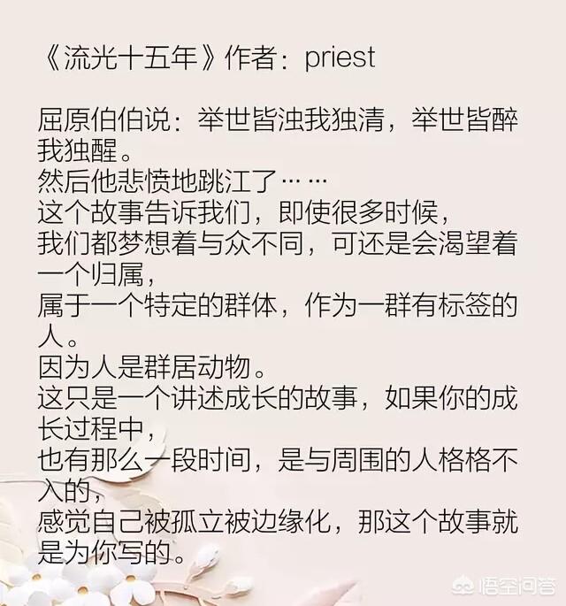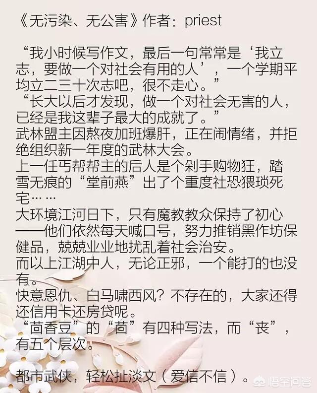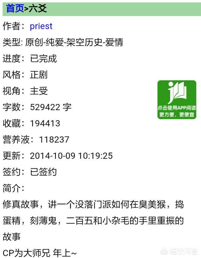 最后推荐一下我比较喜欢的作者Priest。 言情耽美都写 文风格局大气 行文流畅 语言表达上则幽默诙谐; 作品类型也广无论现代古代 玄幻修仙 武侠 玄幻灵异 悬疑推理 科幻都有涉及 她的文是让我一度文荒的 读完太意犹未尽了。