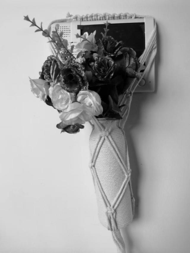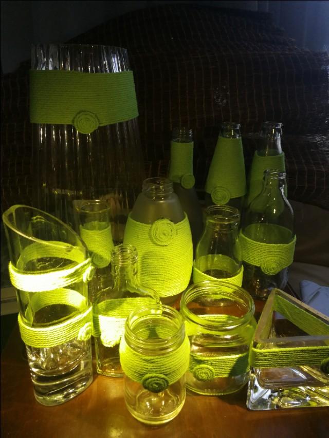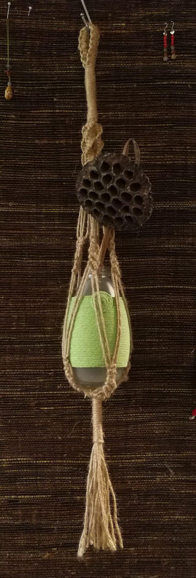 将用过的玻璃瓶。清洗干净。绳艺缠绕。可置景、可置物。再做个网兜。即美观又实用还简单。如下图: