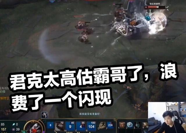 在9分钟左右。君克的瑞文把兵线推到了霸哥塔下。然后准备越塔强杀。熟练的QWQ连招后预判闪现躲到了霸哥身后。准备躲掉霸哥的大招。然后二段R加第三段Q收尾成功越塔。只不过君克还是高估了霸哥。他用瑞文把这一套甩完霸哥都没反应过来。从霸哥的视角来看。霸哥的大招是在死的一瞬间才放出来的。观众慢放找了半天都找不到霸哥是想往哪撞。